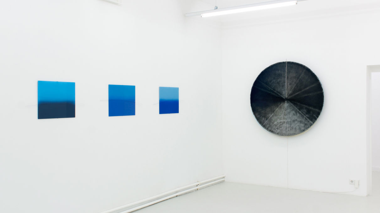 Egalitarianisms blue consists of three works whose glass panels are coated on the reverse with blue gradients – each composed of two adjoining tones. In front of each panel, a single, ultrafine in form and horizontally suspended carbon rod hovers, tinted in one of the two colours. A transparent, barely visible thread holds it in suspension.