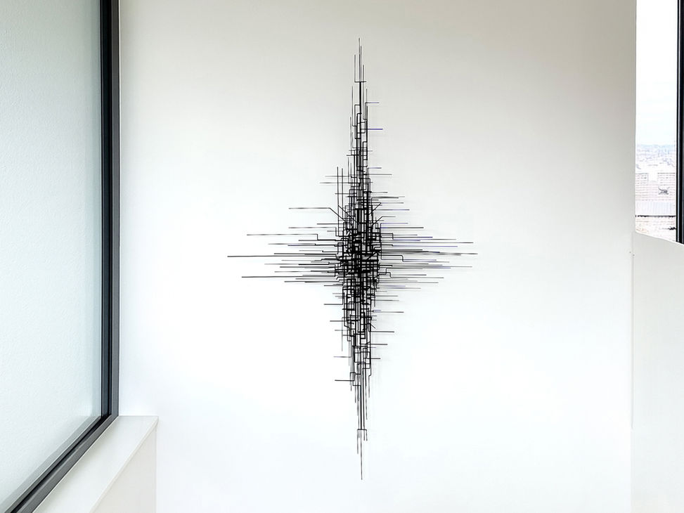 The work appears as if cut directly from the wall. The black withdraws from sight while sharpening perception itself. Where the copper in Linien und Fläche creates resonance and reflection, this surface resists visibility. The lines emerge as pure boundaries – and yet, with every step, the configuration shifts once again: lines move, intersect, form new spaces, and dissolve.
